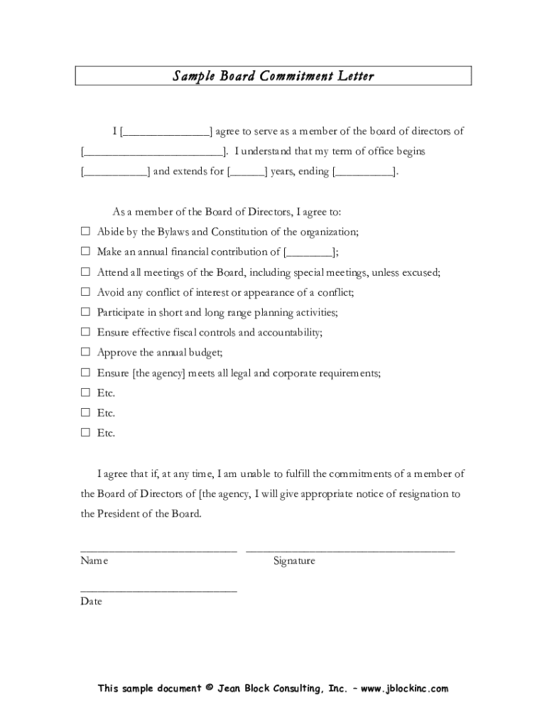 Sample Board Commitment Letter agree to serve as a member of the board of directors of. I understand that my term of office begins and extends for years, ending. As a member of the Board of Directors,