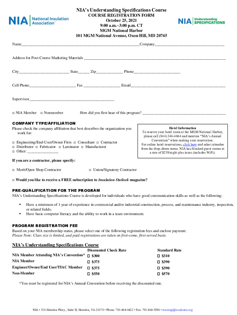 NIA's Understanding Specifications Course REGISTRATION FORM October 25, 2021 9:00 a.m.3:00 p.m. CT MGM National Harbor 101 MGM National Avenue, Oxen Hill, MD 20745 Name Company Address for Discourse