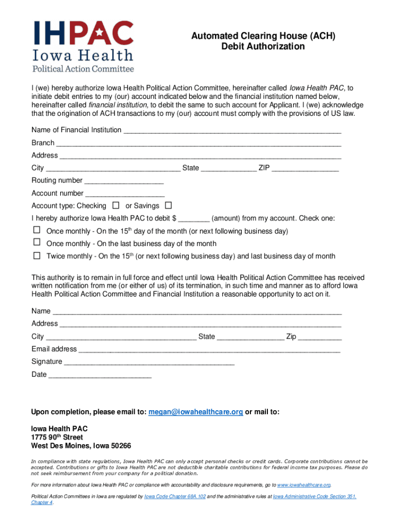 Automated Clearing House (ACH) Debit Authorization (we) hereby authorize Iowa Health Political Action Committee, hereinafter called Iowa Health PAC, to initiate debit entries to my (our) account indicated