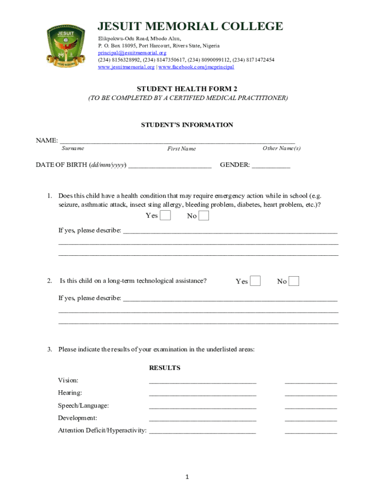 JESUIT MEMORIAL COLLEGE ElikpokwuOdu Road, Body Alum, P. O. Box 18095, Port Harcourt, Rivers State, Nigeria principal jesuitmemorial.org (234) 8156328992, (234) 8147350617, (234) 8090099112, (234)