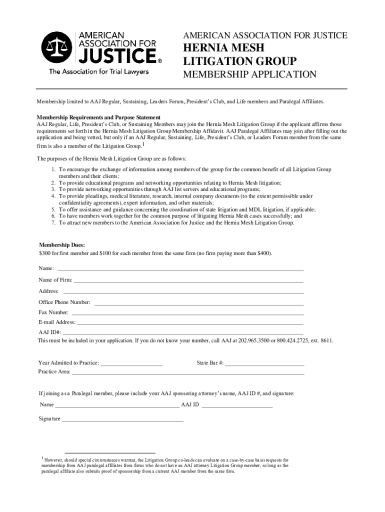 AMERICAN ASSOCIATION FOR JUSTICEHERNIA MESH LITIGATION GROUP MEMBERSHIP APPLICATION Membership limited to AAJ Regular, Sustaining, Leaders Forum, Presidents Club, and Life members and Paralegal Affiliates.
