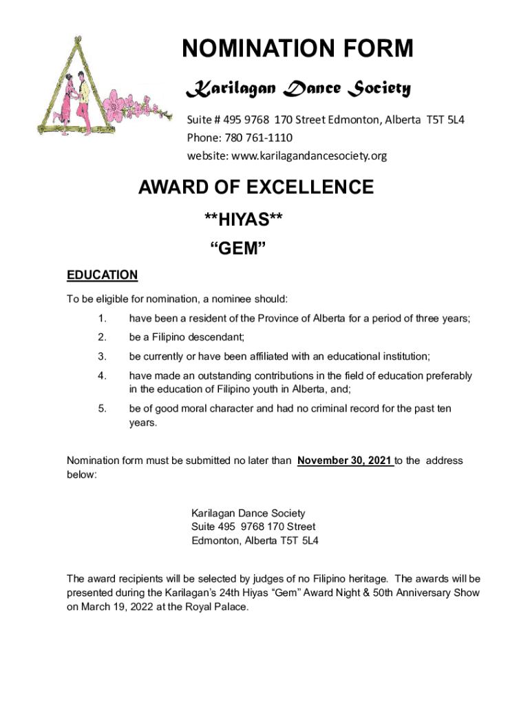 NOMINATION FORM Karilagan Dance Society Suite#4959768170StreetEdmonton,AlbertaT5T5L4 Phone:7807611110 website:www.karilagandancesociety.orgAWARD OF EXCELLENCE **HIYA** GEM EDUCATION To be eligible