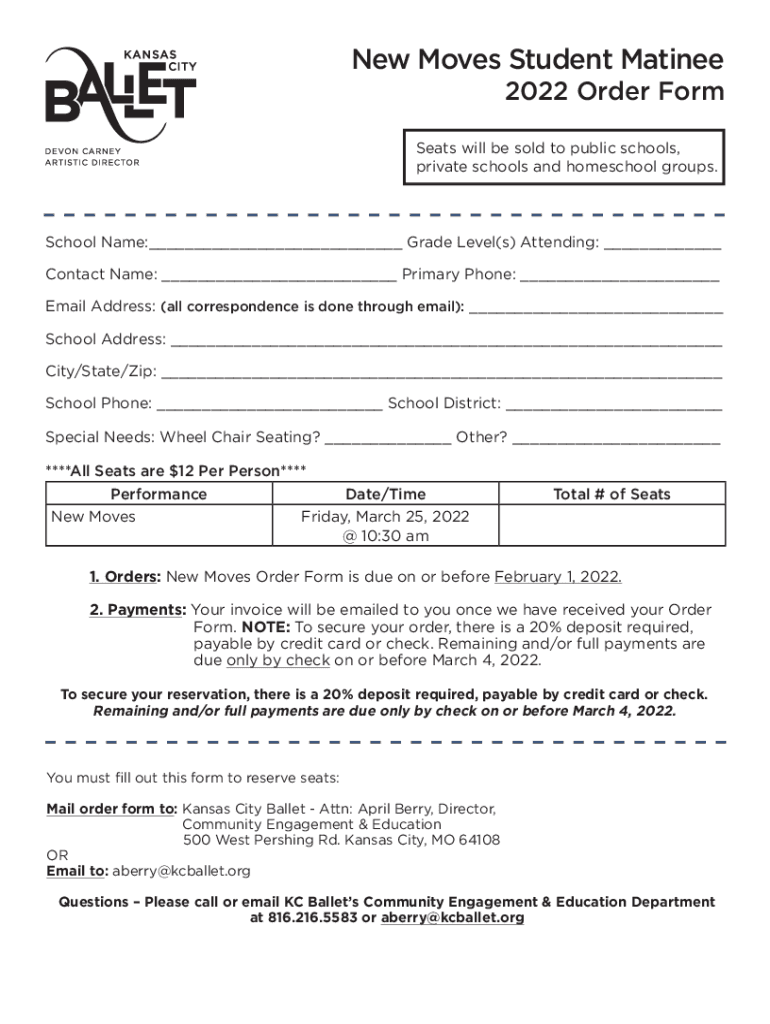 New Moves Student Matinée 2022 Order Form Seats will be sold to public schools, private schools and homeschool groups. School Name: Grade Level(s) Attending: Contact Name: Primary Phone: Email Address: