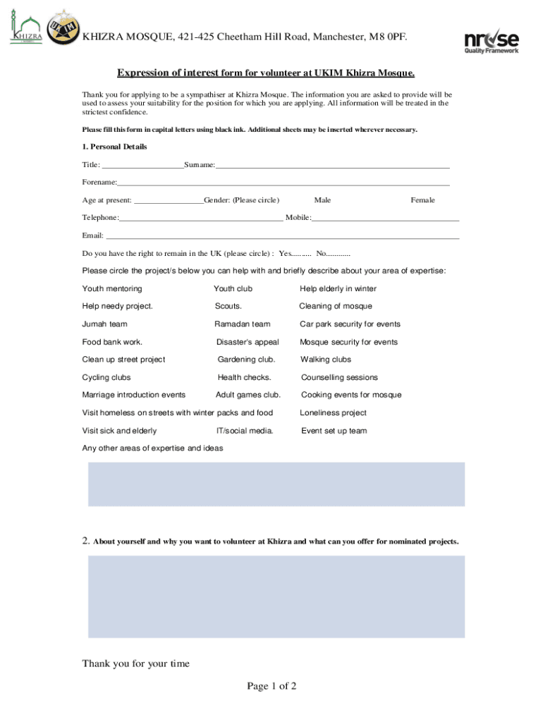 CHIARA MOSQUE, 421425 Cheetham Hill Road, Manchester, M8 0PF. Expression of interest form for volunteer at SKIM Khazar Mosque. Thank you for applying to be a sympathizer at Khazar Mosque. The information