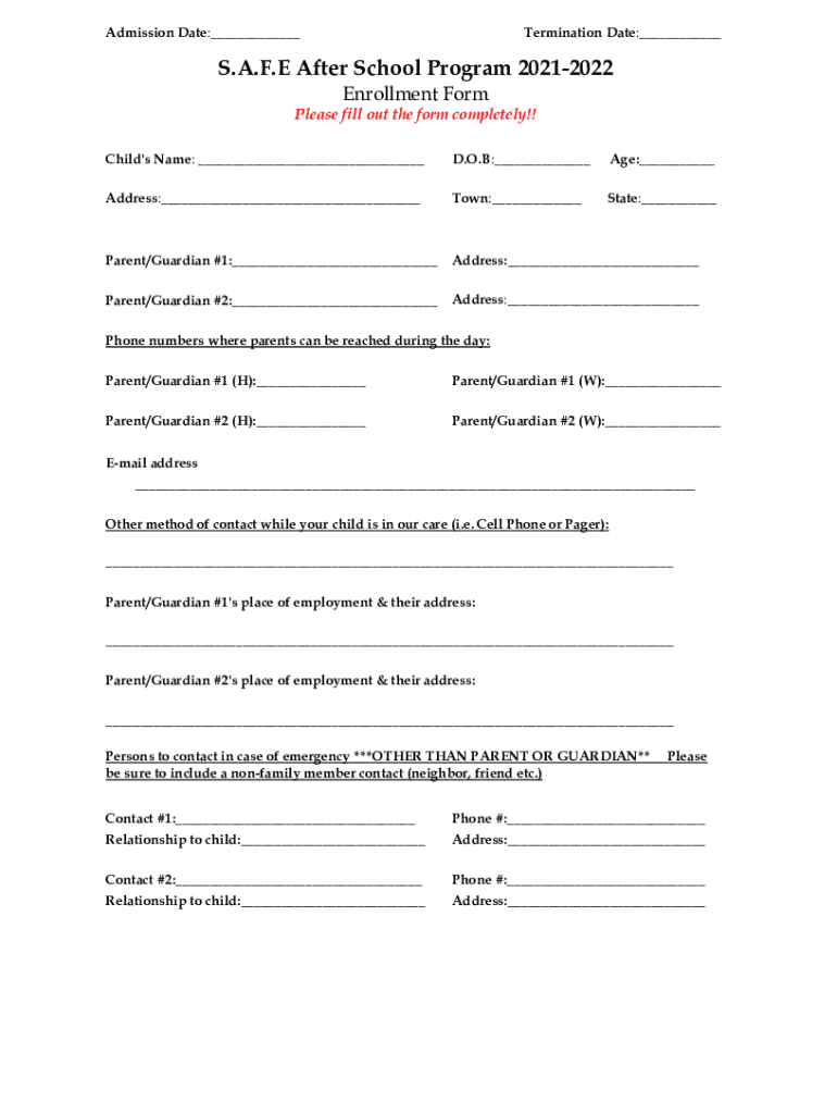 Admission Date: Termination Date: S. A.F.E After School Program 20212022 Enrollment Formulas fill out the form completely!! Child's Name: D. O. B: Age: Address: Town: State: Parent/Guardian #1: Address: