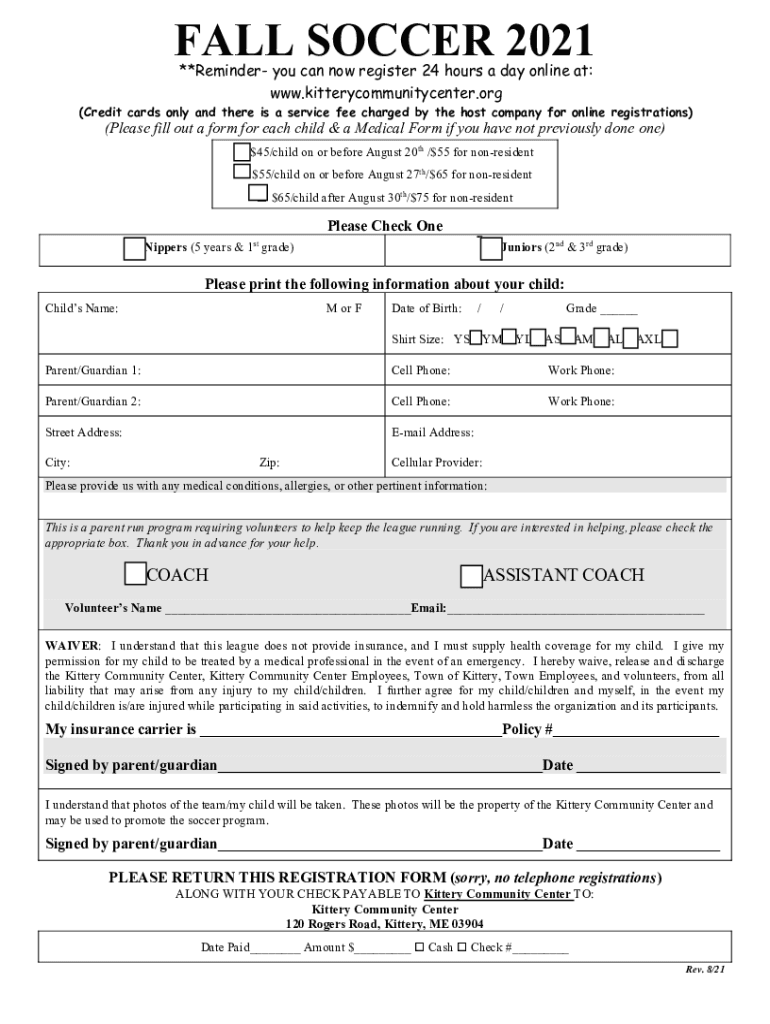 FALL SOCCER 2021 **Reminder you can now register 24 hours a day online at: www.kitterycommunitycenter.org(Credit cards only and there is a service fee charged by the host company for online registrations)(Please