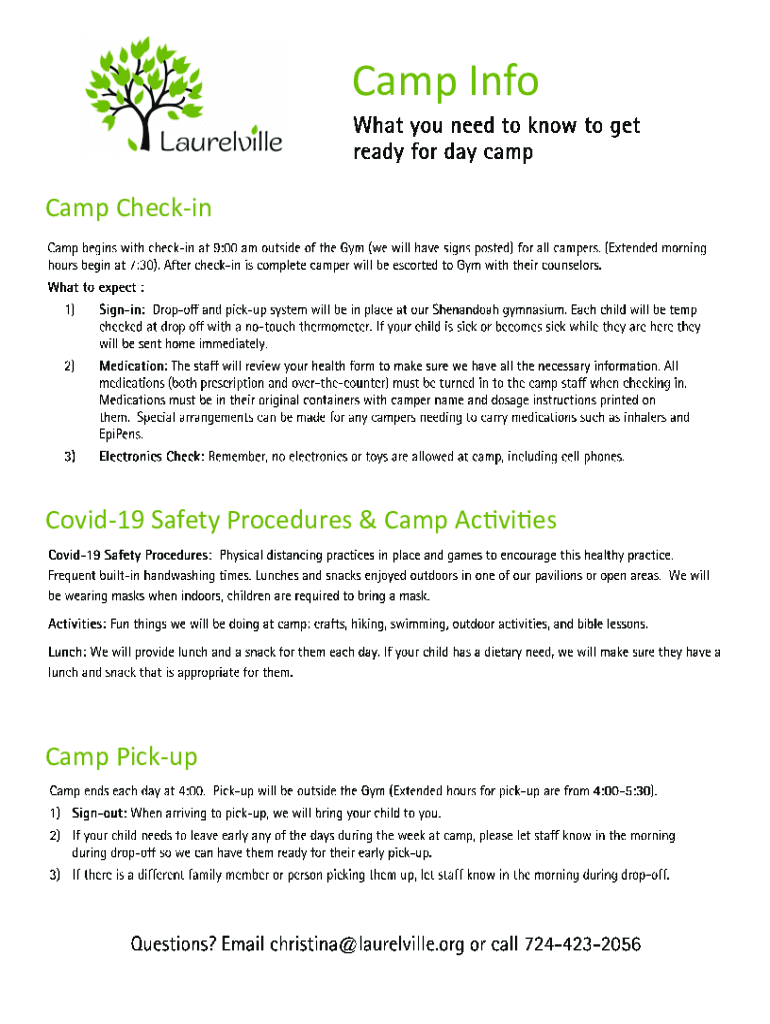 Camp Info Camp CheckinCovid19 Safety Procedures & Camp ActivitiesCamp PickupPacking Mistreat to bright not to bring to Registration Please Return! Day Camp Extended Hours form ($25.00 for the week)