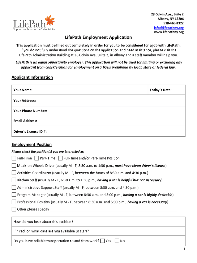 Lifespan Employment Application28 Colvin Ave., Suite 2 Albany, NY 12206 5184653322 info@lifepathny.org www.lifepathny.orgThis application must be filled out completely in order for you to be considered