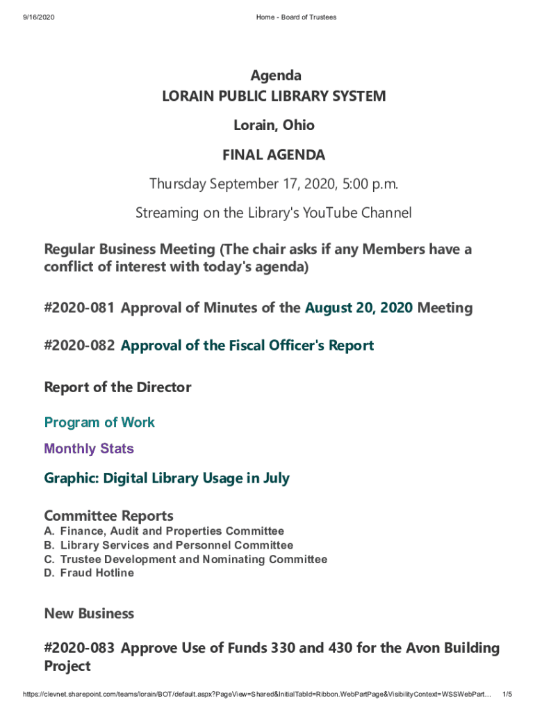 9/16/2020Home Board of TrusteesAgenda LORAIN PUBLIC LIBRARY SYSTEM Lorain, Ohio FINAL AGENDA Thursday, September 17, 2020, 5:00 p.m. Streaming on the Library\'s YouTube Channel Regular Business Meeting