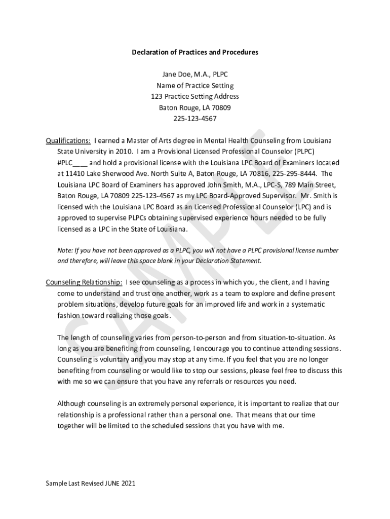 Declaration of Practices and Procedures Jane Doe, M.A., LPC Name of Practice Setting 123 Practice Setting Address Baton Rouge, LA 70809 2251234567 Qualifications: I earned a Master of Arts degree