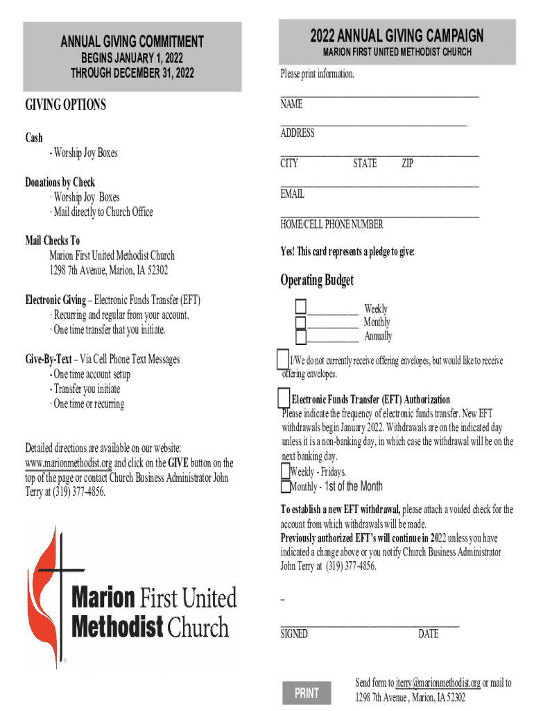 2022 ANNUAL GIVING CAMPAIGNANNUAL GIVING COMMITMENT BEGINS JANUARY 1, 2022, THROUGH DECEMBER 31, 2022GIVING OPTIONS Castration FIRST UNITED METHODIST CHURCHPlease print information. NAME ADDRESS Worship