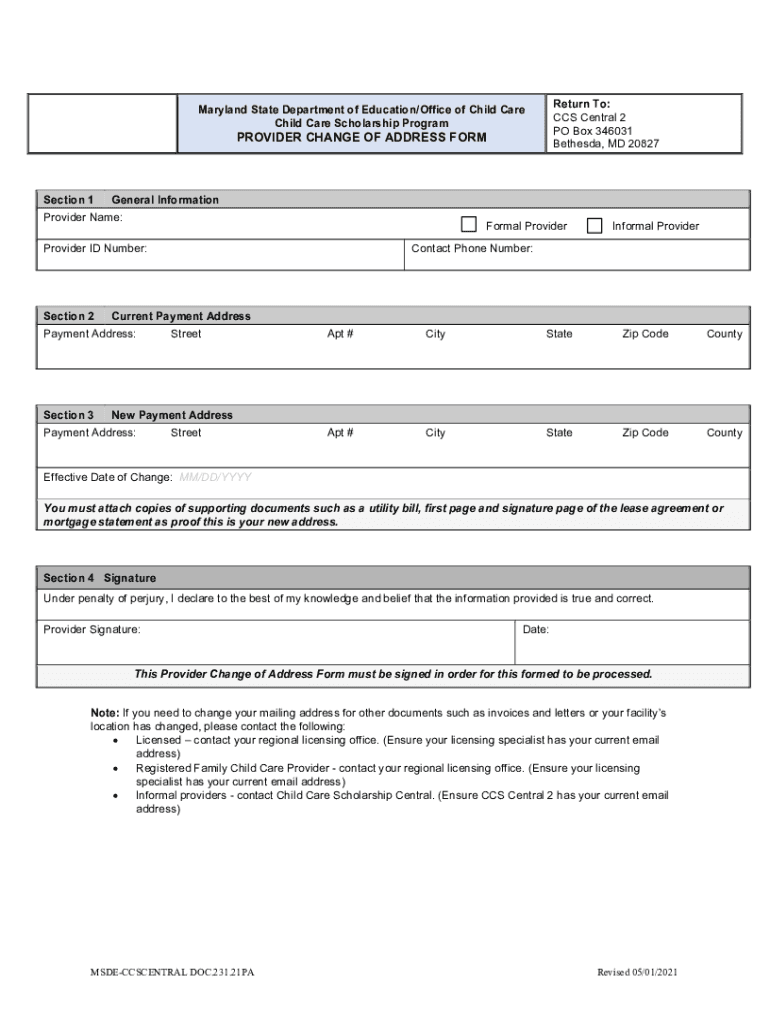 Return To: CCS Central 2 PO Box 346031 Bethesda, MD 20827Maryland State Department of Education/Office of Child Care Scholarship ProgramPROVIDER CHANGE OF ADDRESS Formation 1General InformationProvider