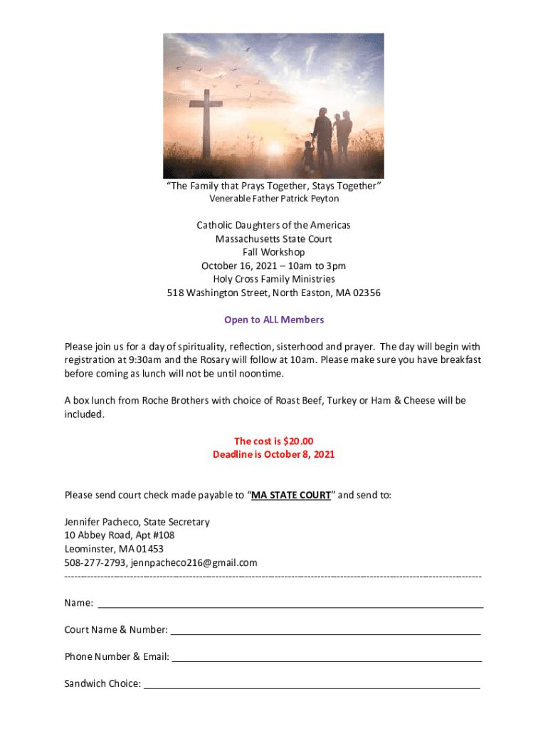 The Family that Prays Together, Stays Together Venerable Father Patrick PeytonCatholic Daughters of the Americas Massachusetts State Court Fall Workshop October 16, 2021 10am to 3pm Holy Cross Family