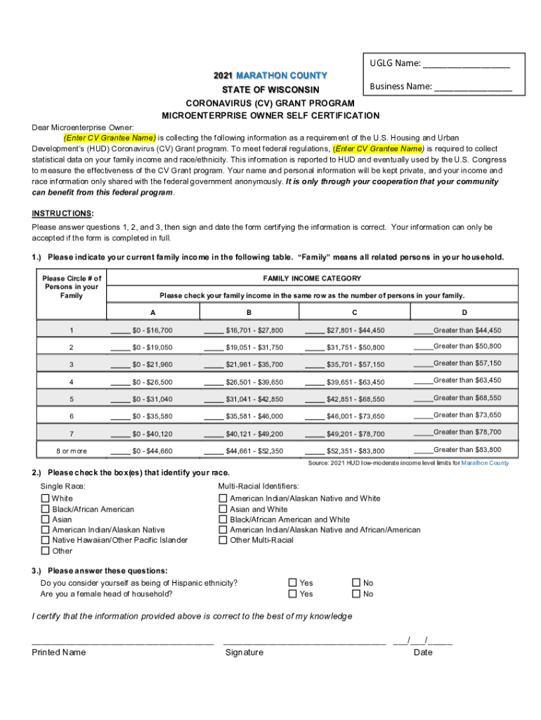 UGLY Name: 2021 MARATHON COUNTYBusiness Name: STATE OF WISCONSINCORONAVIRUS (CV) GRANT PROGRAM MICROENTERPRISE OWNER SELF CERTIFICATIONDear Microenterprise Owner: (Enter CV Grantee Name) is collecting