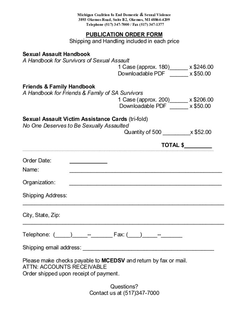 Michigan Coalition to End Domestic & Sexual Violence 3893 Demos Road, Suite B2, Demos, MI 488644209 Telephone (517) 3477000 / Fax (517) 3471377PUBLICATION ORDER FORM Shipping and Handling included