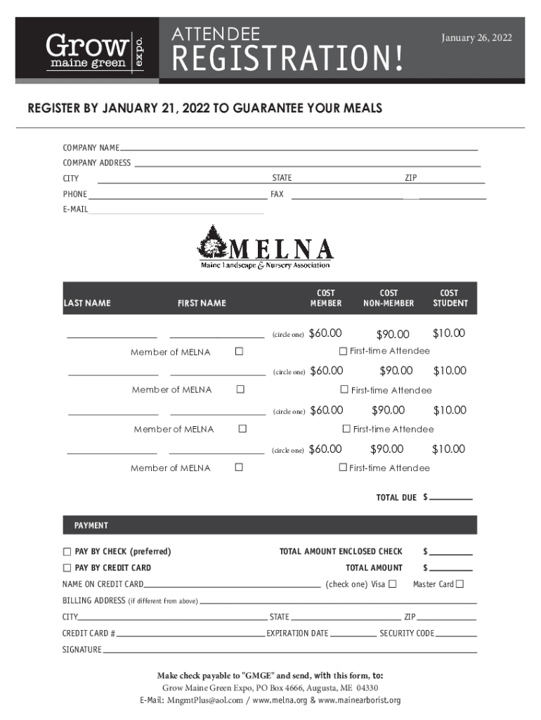 ATTENDEE January 26, 2022REGISTRATION! REGISTER BY JANUARY 21, 2022, TO GUARANTEE YOUR MEALS COMPANY NAME COMPANY ADDRESS CITYSTATEPHONEFAXZIPEMAILLAST NAMES MEMBERFIRST NAME (circle one)$60.00 (circle