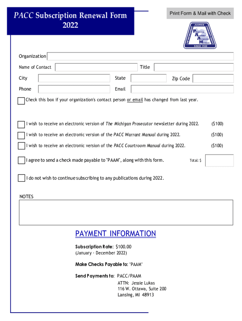 PACE Subscription Renewal Form 2022Print Form & Mail with CheckOrganization Name of ContactTitleCityStatePhoneEmailZip Code Check this box if your organization's contact person or email has changed
