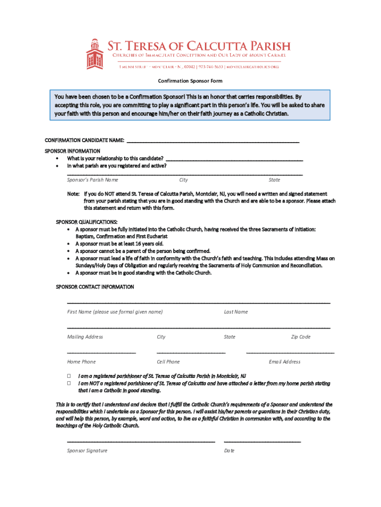 Confirmation Sponsor Form have been chosen to be a Confirmation Sponsor! This is an honor that carries responsibilities. By accepting this role, you are committing to play a significant part in these