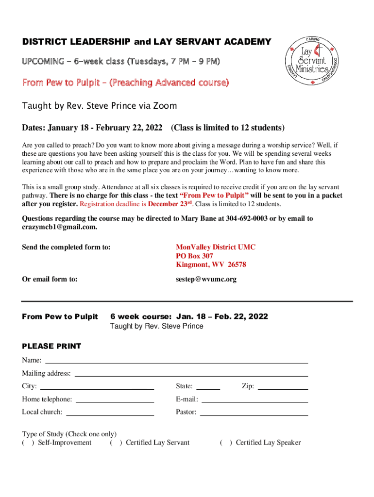 DISTRICT LEADERSHIP and LAY SERVANT ACADEMY UPCOMING 6week class (Tuesdays, 7 PM 9 PM)From Pew to Pulpit (Preaching Advanced course) Taught by Rev. Steve Prince via Zoom Dates: January 18 February