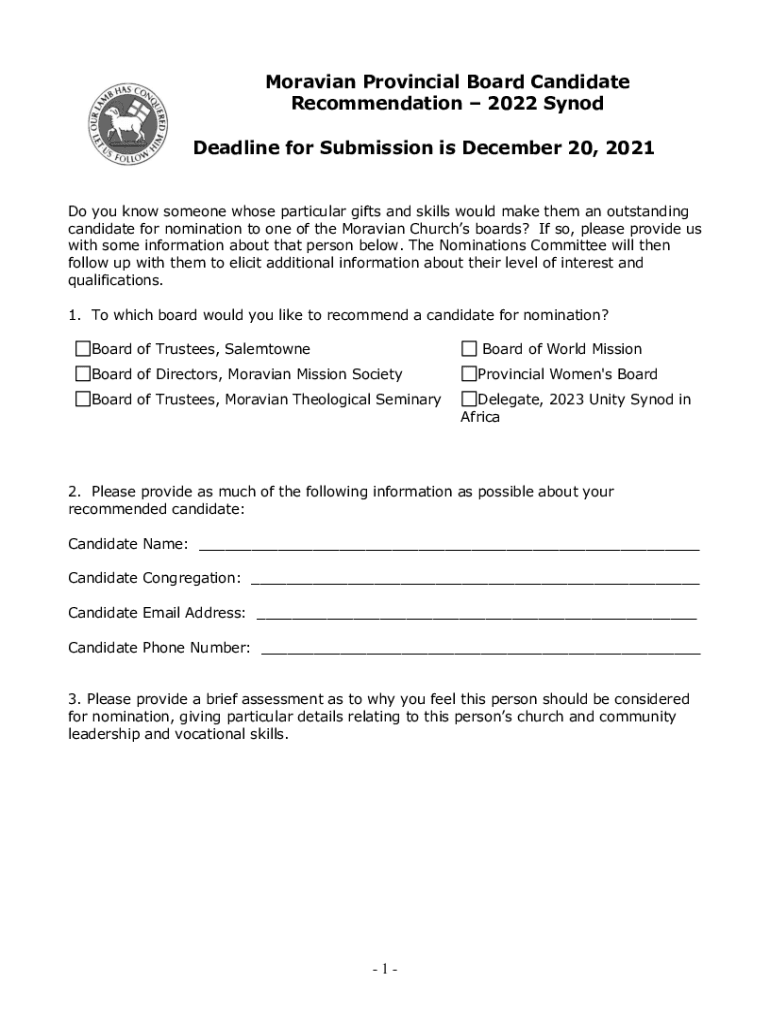 Moravian Provincial Board Candidate Recommendation 2022 Synod Deadline for Submission is December 20, 2021, Do you know someone whose particular gifts and skills would make them an outstanding candidate
