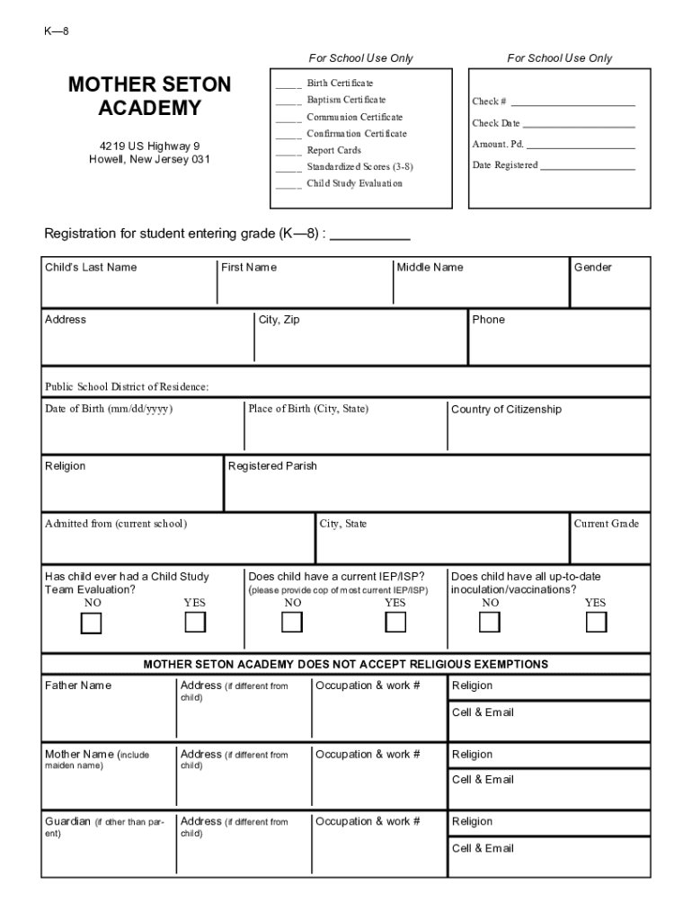 K8 For School Use OnlyMOTHER SETON Academy School Use Only Birth Certificate Baptism CertificateCheck # Communion CertificateCheck Date Confirmation Certificate4219 US Highway 9 Howell, New Jersey