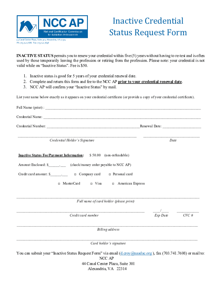 Inactive Credential Status Request Form44 Canal Center Plaza, Suite 301, Alexandria, VA 22314 pH: 703.741.7686 Fax: 703.741.7698INACTIVE STATUS permits you to renew your credential within five (5)