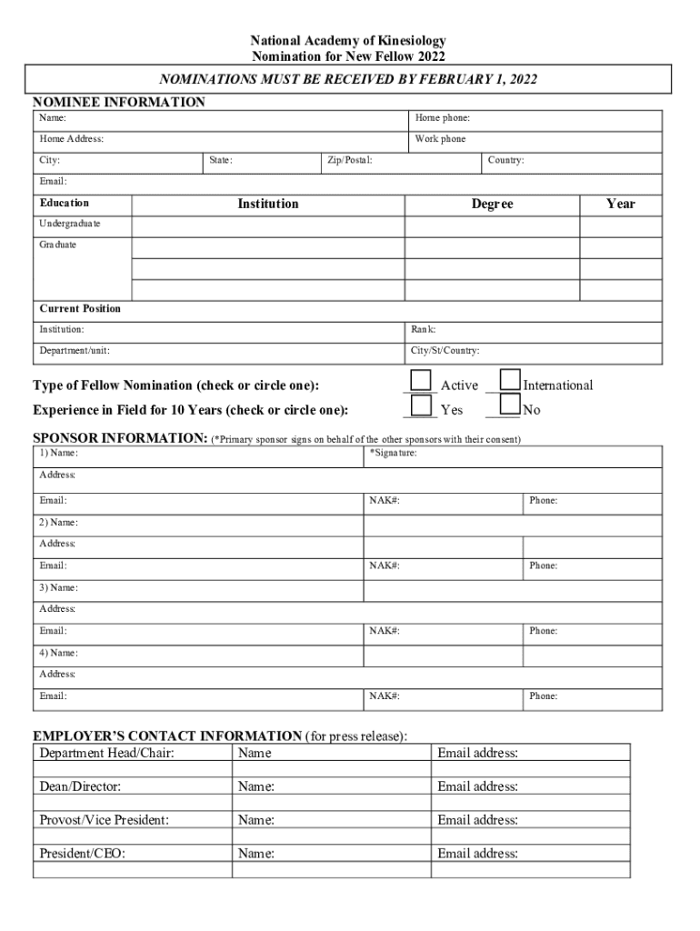 Get the free New Fellow Nomination Form - National Academy of Kinesiology