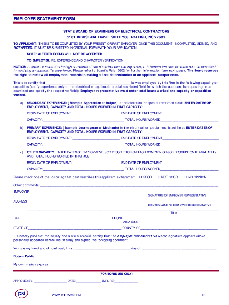 EMPLOYER STATEMENT FORM STATE BOARD OF EXAMINERS OF ELECTRICAL CONTRACTORS 3101 INDUSTRIAL DRIVE, SUITE 206, RALEIGH, NC 27609 TO APPLICANT: THIS IS TO BE COMPLETED BY YOUR PRESENT OR PAST EMPLOYER.