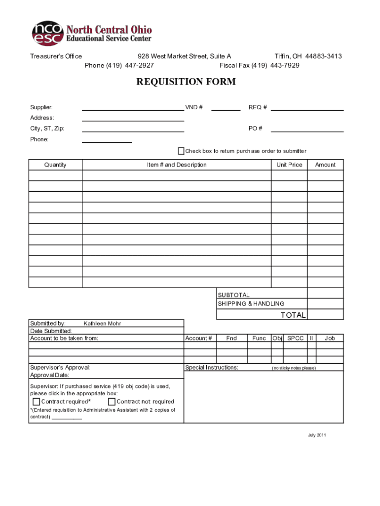 Treasurer's Office928 West Market Street, Suite A Tiffing, OH 448833413 Phone (419) 4472927 Fiscal Fax (419) 4437929REQUISITION FORM Supplier:VND #REQ #Address: City, ST, Zip:PO #Phone: Check box