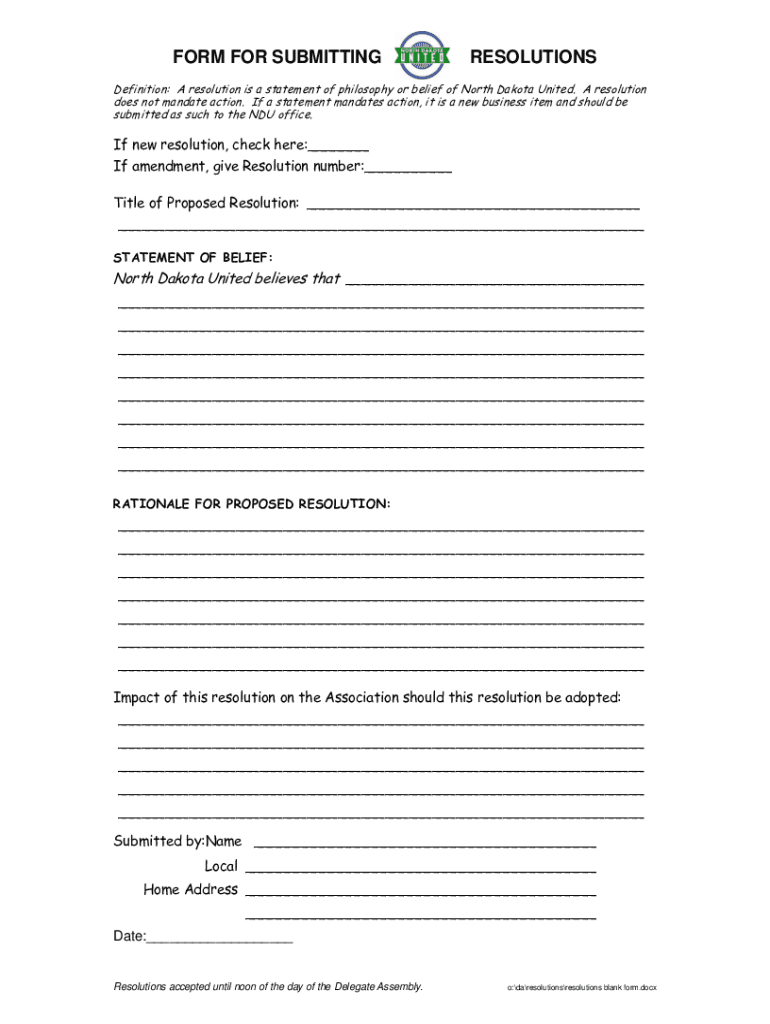 FORM FOR SUBMITTINGRESOLUTIONSDefinition: A resolution is a statement of philosophy or belief of North Dakota United. A resolution does not mandate action. If a statement mandates action, it is a