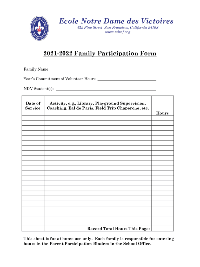 Cole Notre Dame DES Victories 659 Pine Street San Francisco, California 94108 www.ndvsf.org20212022 Family Participation Form Family Name Years Commitment of Volunteer Hours: NOV Student(s): Date