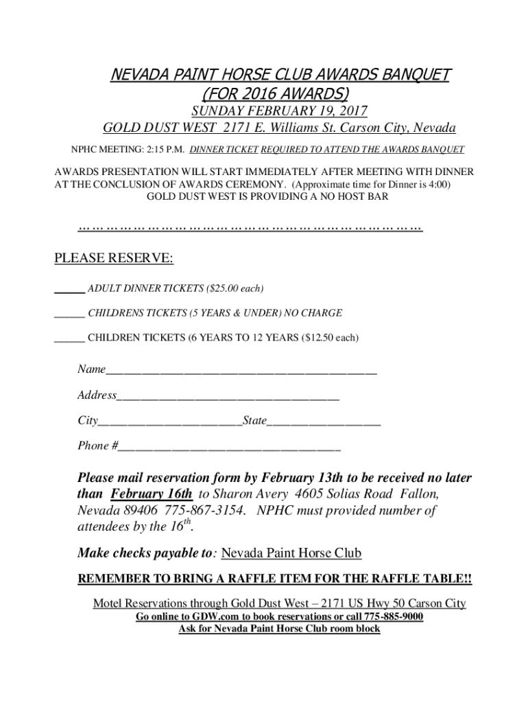 NEVADA PAINT HORSE CLUB AWARDS BANQUET (FOR 2016 AWARDS) SUNDAY, FEBRUARY 19, 2017, GOLD DUST WEST 2171 E. Williams St. Carson City, Nevada NPHC MEETING: 2:15 P.M. DINNER TICKET REQUIRED TO ATTEND