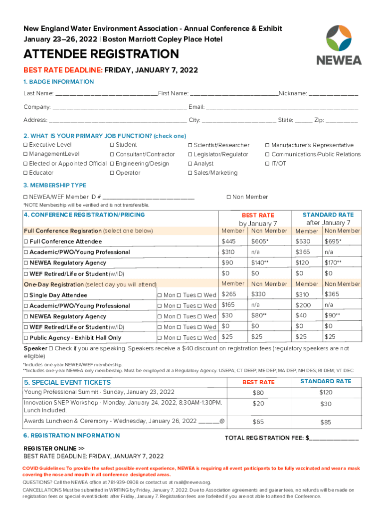 New England Water Environment Association Annual Conference & Exhibit January 2326, 2022 Boston Marriott Copley Place HotelATTENDEE REGISTRATION BEST RATE DEADLINE: FRIDAY, JANUARY 7, 2022 1. BADGE