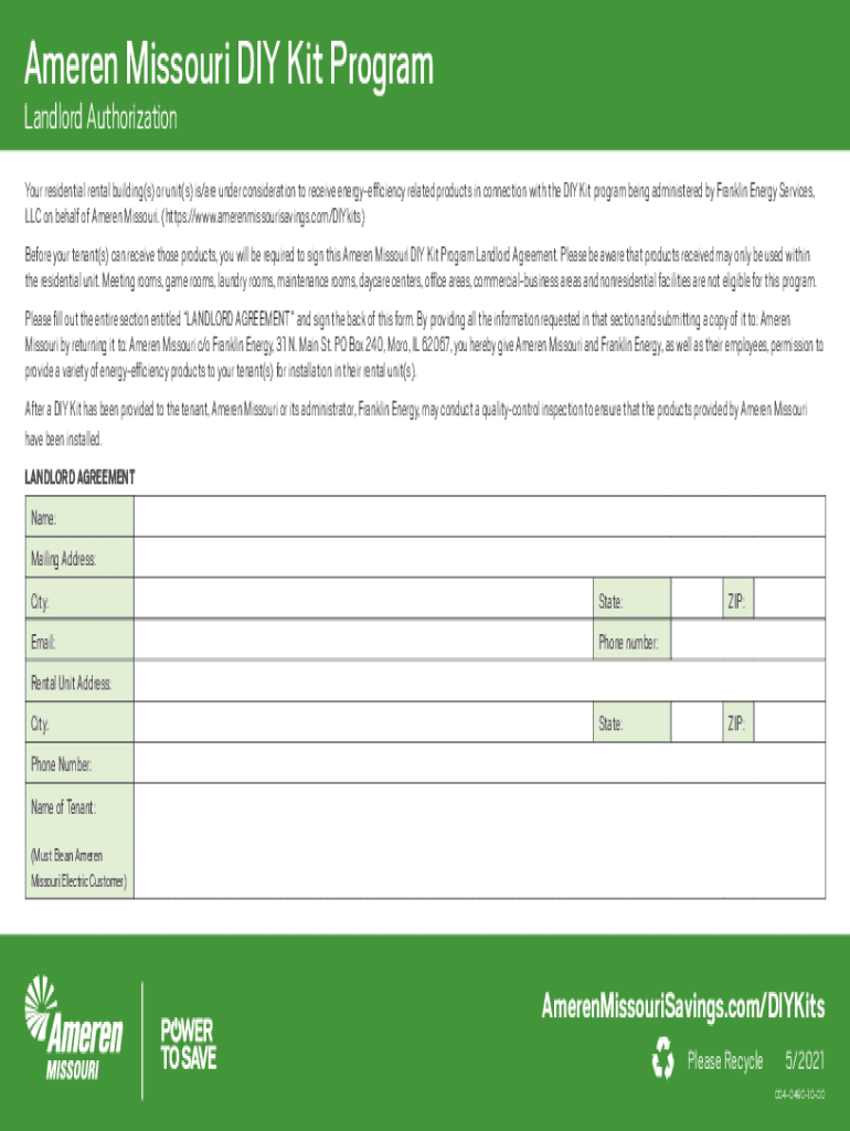 Mean Missouri DIY Kit Program Landlord AuthorizationYour residential rental building(s) or unit(s) is/are under consideration to receive energy efficiency related products in connection with the DIY