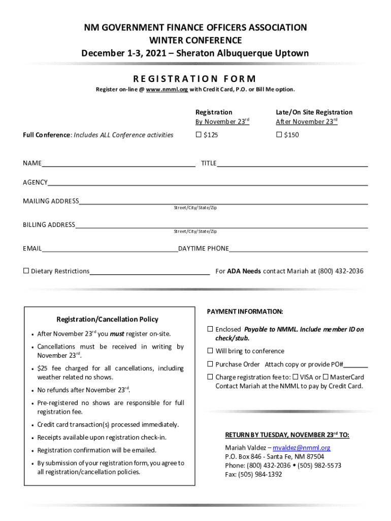 NM GOVERNMENT FINANCE OFFICERS ASSOCIATION WINTER CONFERENCE December 13, 2021, Sheraton Albuquerque Uptown REGISTRATION Preregister online www.nmml.org with Credit Card, P.O. or Bill Me option. Full