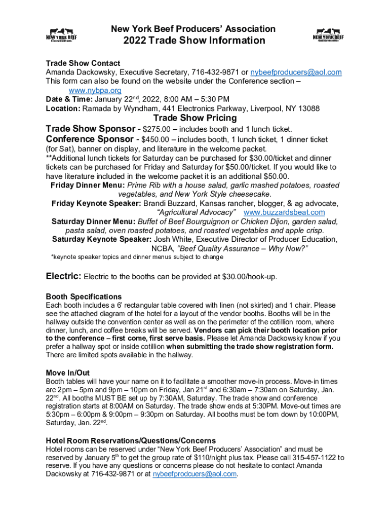 New York Beef Producers Association2022 Trade Show InformationTrade Show Contact Amanda Dackowsky, Executive Secretary, 7164329871 or nybeefproducers aol.com This form can also be found on the website