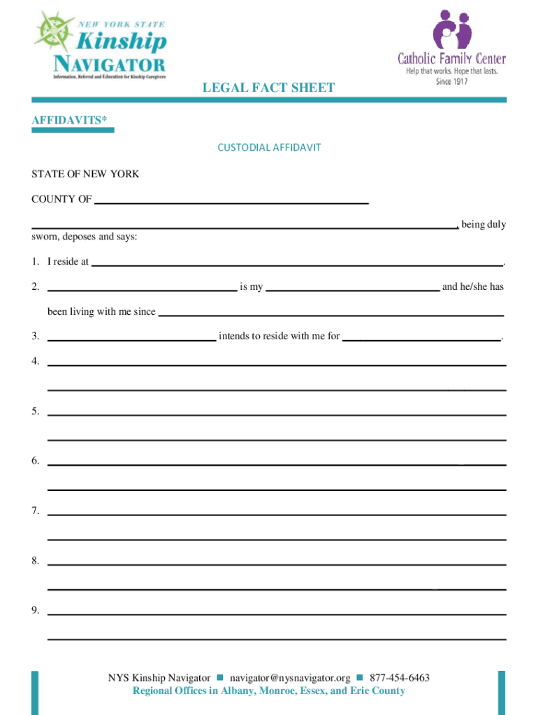 LEGAL FACT SHEET AFFIDAVITS* CUSTODIAL AFFIDAVIT STATE OF NEW YORK COUNTY OF sworn, deposes and says:, being duly1. I reside at. 2. is my and he/she has been living with me since 3. Intends to reside