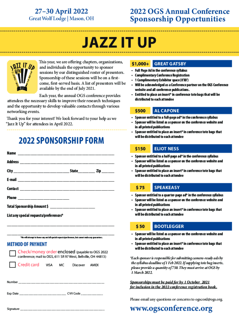 2730 April 2022Great Wolf Lodge Mason, OH2022 DOGS Annual Conference Sponsorship OpportunitiesJAZZ IT UP 273 0 APR IL MASS NOGS2202This year, we are offering chapters, organizations, and individuals