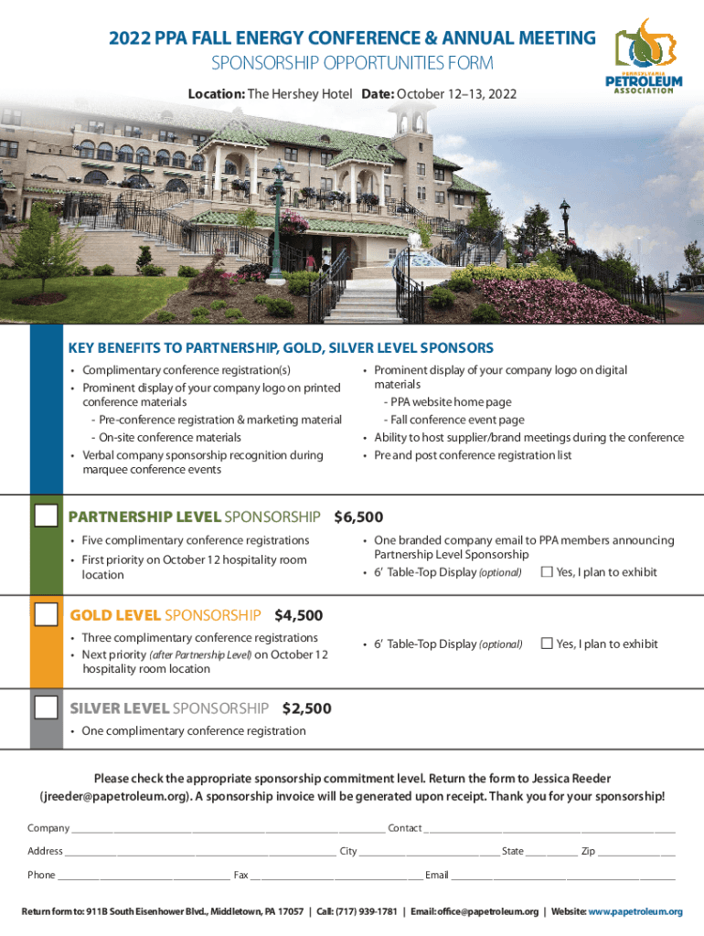 2022 PPA FALL ENERGY CONFERENCE & ANNUAL MEETING SPONSORSHIP OPPORTUNITIES FORM Location: The Hershey Hotel Date: October 1213, 2022KEY BENEFITS TO PARTNERSHIP, GOLD, SILVER LEVEL SPONSORS Complimentary