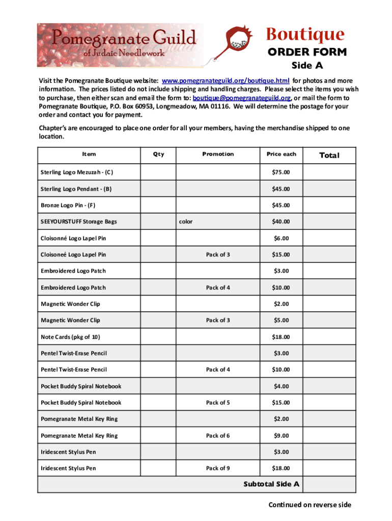 Boutique ORDER FORM Side Visit the Pomegranate Boutique website:www.pomegranateguild.org/bouPque.htmlfor photos and moreinformaPon. The prices listed do not include shipping and handling charges.
