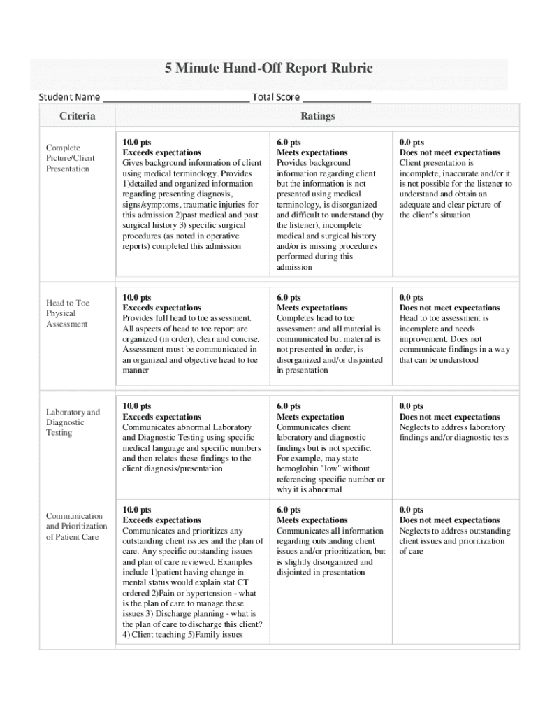 5-Minute Standoff Report Rubric Student Name Total Score Criteria Complete Picture/Client Presentation Head to Toe Physical AssessmentLaboratory and Diagnostic TestingCommunication and Prioritization