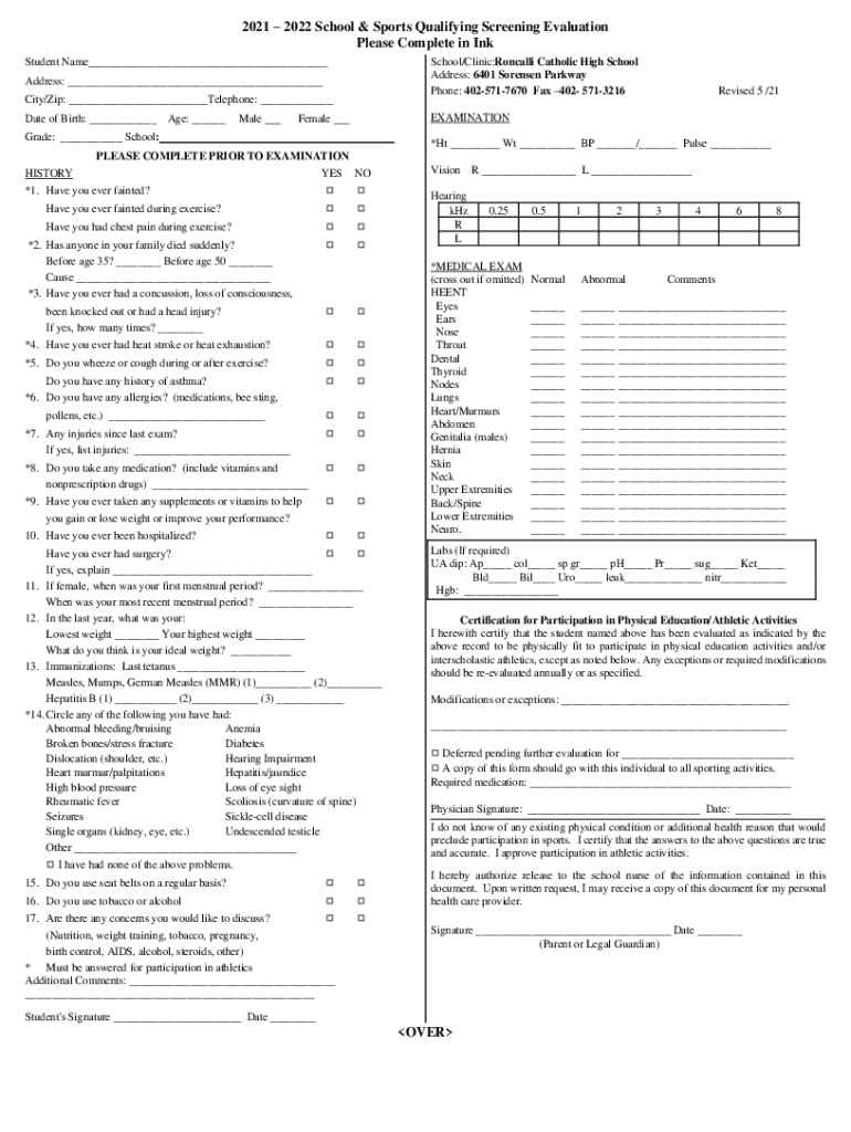 Get the free Sports Physical Form - Roncalli Catholic High School