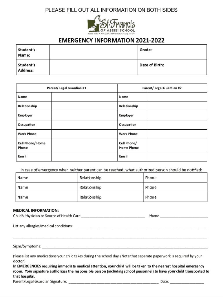 PLEASEFILLOUTALLINFORMATIONONBOTHSIDES EMERGENCYINFORMATION20212022 Students Name: Grade: Students Address: Date FB birth: Parent/LegalGuardian#1 Parent/LegalGuardian#2 Name Relationship
