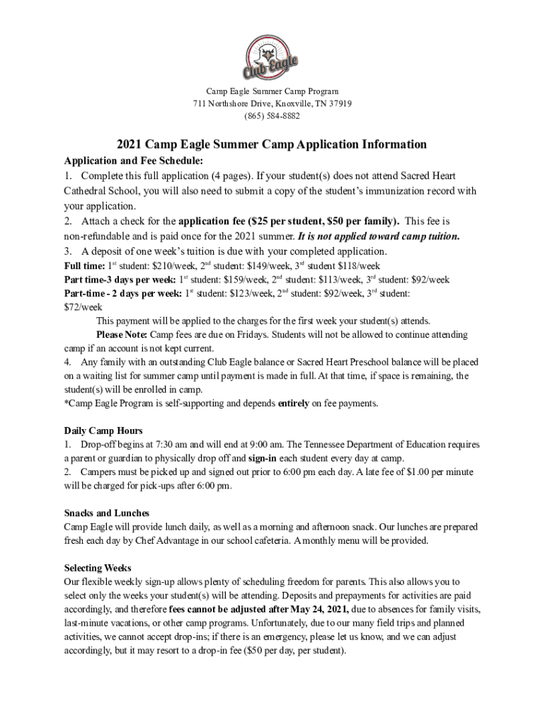 Camp Eagle Summer Camp Program 711 North shore Drive, Knoxville, TN 37919 (865) 58488822021 Camp Eagle Summer Camp Application Information Application and Fee Schedule: 1. Complete this full application