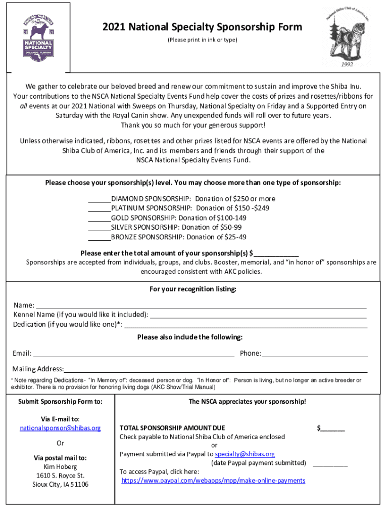 Get the free 2021 National Specialty Sponsorship Form - nscanationalspecialty shibas