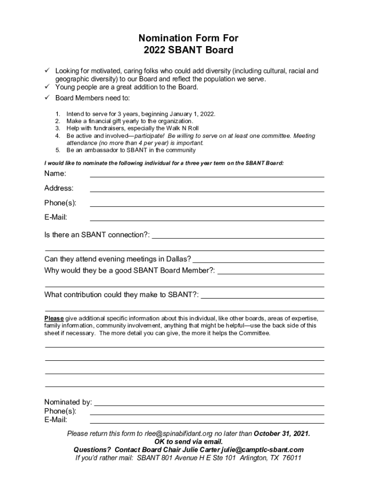 Get the free Nomination Form For 2022 SBANT Board - spinabifidant.org
