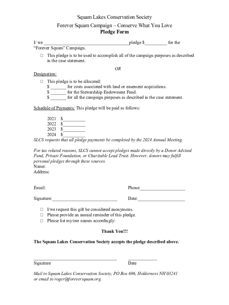 Squad Lakes Conservation Society Forever Squad Campaign Conserve What You Love Pledge Form I/ we pledge $ for the Forever Squad Campaign. This pledge is to be used to accomplish all the campaign purposes