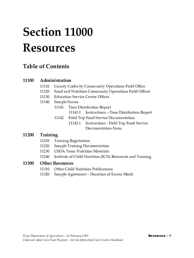 Section 11000 Resources Table of Contents 11100Administration 11110 11120 11130 1114011200Training 11210 11220 11230 1124011300County Codes by Community Operations Field Office Food and Nutrition