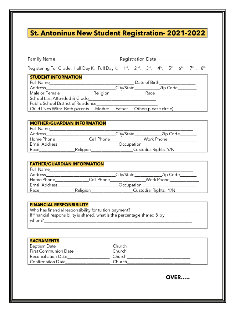 St. Antoninus New Student Registration 20212022Family Name Registration Date Registering For Grade: Half Day K, Full Day K,1st,2nd,3rd,4th,5th, 6th,7th, 8th,STUDENT INFORMATION Full Name Date of Birth