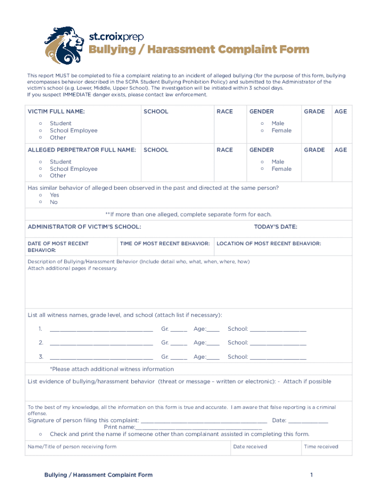 Anyone who has witnessed or experienced bullying or harassment is required to file a bullying complaint report form.